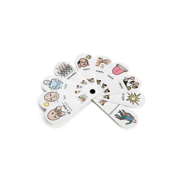 The visual communication fan can be used to support individuals to communicate how they are feeling. Sometimes behaviour is a form of communication and these fans can help find what the communication is behind that behaviour. Help students identify how they are feeling in relation to sensory overload and communicate their sensitivities. Please note that these fans are not toys and should be used under supervision.
