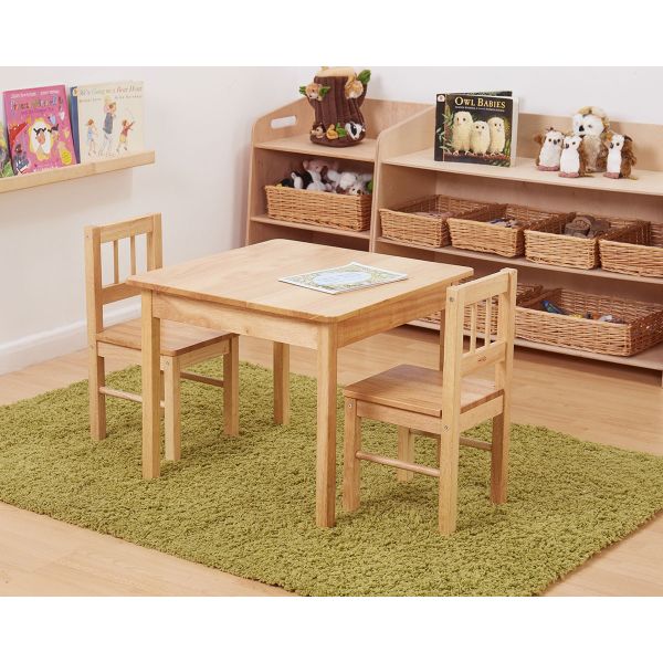 Natural Wood Table And Chairs (3Pk) offers a thoughtfully designed, durable resource for hands-on learning. A simple yet effective functional table and chairs for creating a homely environment. Chair: H56.5 x W27 x L29cm, Table: H51 x W60.5 x L60.5cm.