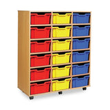 Monarch deep tray storage unit - 18 trays (3 x 6)-(EHH-MEQ4018NL) offers a thoughtfully designed, durable resource for hands-on learning. The Monarch extra deep tray storage unit This Monarch deep tray storage unit is available with 12, 16, or 18 deep trays and is complete with castors for easy transportability. In a beech finish and made from sustainably sourced and FSC certified MFC, this unit will be sure to last all the trials of a classroom. Each storage unit is constructed using 18mm Egger MFC and fitted together by cam and dowel construction for extra rigidity and assured quality. These Monarch shallow tray units are supplied with strong non-marking shatterproof nylon castors, two of which come with a locking facility. Each have a load capacity of 58kg's with a twin wheeled and hooded construction. Engineered to fit to a reinforced steel plate fixed to the underside of the unit for better performance and greater durability. Easy to clean - simply use a soft dry cloth.