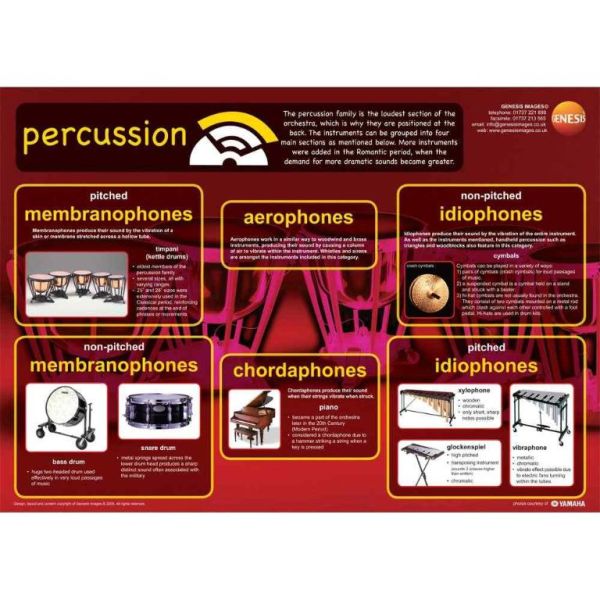 Percussion instruments - A1 educational poster-(EHH-GNS-23) offers a thoughtfully designed, durable resource for hands-on learning. Introducing the percussion instruments wall poster This educational wallchart from Genesis Images clearly defines the six categories of percussion €“ pitched and non-pitched membraphones, pitched and non-pitched idiophones, aerophones and chordaphones €“ with examples and pictures of all the instruments you are likely to encounter in Western classical music. Each poster is expertly designed, eye-catching and full of detailed information. They€™re also made from quality 120gsm silk poster paper, which is durable and built to last for many years. These wallcharts are the perfect way for teachers to decorate their music classroom, practice room or studio walls with useful information for students of different ages to learn from. This poster can be purchased on its own or as part of the convenient and cost effective GNS-42 set of 8. The posters in the Musical Instruments series are designed to teach a wide variety of musical knowledge and skills. 23.