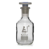Bottle Reagent, made of borosilicate glass, narrow mouth with acid proof polypropylene stopper 60ml., socket size 14/23-EIS-CH0160B offers a thoughtfully designed, durable resource for hands-on learning. The opening of the bottle is 0.55"at the top (it's widest point) and slightly tapers in. The base diameter of the bottle is 1.8" and the overall height is 3.7". Please note: these are hand blown with the capacity in mind and overall dimensions can vary slightly. Hand blown premium borosilicate 3.3 glass. The stopper is socket size 14/23, made of polypropylene, and is acid proof and autoclavable. Designed to store liquids in the laboratory, but can be used in the home as well -- or even in a set for "potions". Top rack dishwasher safe. Premium borosilicate reagent bottles with acid proof polypropylene stoppers. Eisco glassware is designed to be used in labs but is often used in homes or garages as well. Eisco Labs Borosilicate glass has the following heat tolerances: Strain Point -515°C | Annealing Point 565°C | Softening Point 820°C.