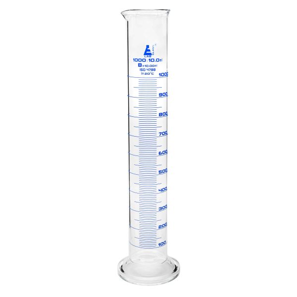 Cylinder Measuring Graduated, cap. 1000ml., class 'B', round base with spout, borosilicate glass, Blue Graduation-EIS-CH0344F offers a thoughtfully designed, durable resource for hands-on learning. 1000ml graduated measuring cylinder made of high quality, heavy duty Borosilicate 3.3 glass. Spout for easy pouring, and round base for extra stability. Class B tolerance, ±10.0ml as per DIN EN ISO 4788 standard. Blue printed graduations and specifications. 10ml subdivisions. Cylinder stands 17.75" tall, with a base measuring 4.5" wide. Inner diameter of cylinder body measures 63mm (2.5"), and outer diameter measures 73mm (2.9"). Autoclavable, with superior chemical durability. Low temperature gradient- can withstand high temperatures & thermal shocks. Eisco Labs Borosilicate glass has the following heat tolerances: Strain Point -515°C | Annealing Point 565°C | Softening Point 820°C. Calibrated to contain.