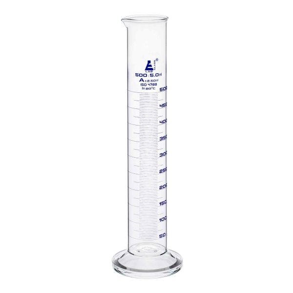 Cylinder Measuring Graduated, cap. 500ml., class 'A', round base with spout, borosilicate glass, Blue Graduation-EIS-CH0344N offers a thoughtfully designed, durable resource for hands-on learning. 500ml graduated measuring cylinder made of high quality, heavy duty Borosilicate 3.3 glass. Spout for easy pouring, and round base for extra stability. Class A tolerance, ±2.50ml as per DIN EN ISO 4788 standard. Blue printed graduations and specifications. 5ml subdivisions. Cylinder stands 14.25" tall, with a base measuring 3.6" wide. Inner diameter of cylinder body measures 50mm (2"), and outer diameter measures 59mm (2.3"). Autoclavable, with superior chemical durability. Low temperature gradient- can withstand high temperatures & thermal shocks. Eisco Labs Borosilicate glass has the following heat tolerances: Strain Point -515°C | Annealing Point 565°C | Softening Point 820°C. Calibrated to contain.