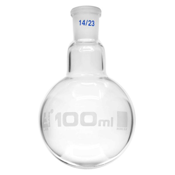 • Made of high quality, heavy duty borosilicate glass 100ml capacity single joint with 14/23 size socket stands 4.25" tall, neck measures 1.125" wide, and bottom diameter measure 2.5" perfect for any science or home laboratory 100ml capacity boiling flask made of high quality, heavy duty borosilicate glass.