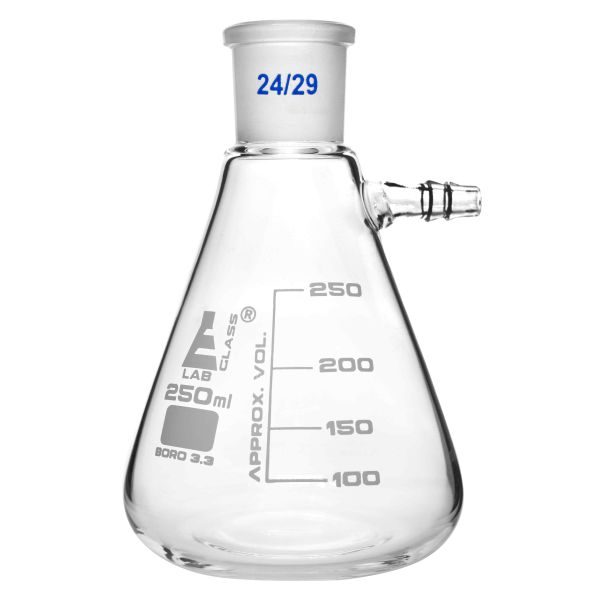 Flask Filtering Buchner, cap. 250ml, Socket 24/29-EIS-CH0422C offers a thoughtfully designed, durable resource for hands-on learning. Made of high quality, heavy duty Borosilicate glass 250ml capacity Top and side joints 24/29 size socket Stands 5" tall. Base measures 3.5" in diameter. Side socket arm measures 0.9" long Perfect for any science or home laboratory 250ml capacity Buchner filtering flask made of high quality, heavy duty borosilicate glass. Interchangeable joint and side arm. 24/29 size socket. No stopper included. Flask measures 5" tall. Base measures 3.5" in diameter. Side arm measures 0.9" long Autoclavable, with superior chemical durability. Low temperature gradient- can withstand high temperatures & thermal shocks. Eisco Labs Borosilicate glass has the following heat tolerances: Strain Point -515°C | Annealing Point 565°C | Softening Point 820°C. Eisco Labs proudly manufactures its own products using state-of-the-art equipment, and following the highest standards of quality control. Each product is carefully designed by a team of laboratory professionals and experienced engineers with quality and durability in mind. They are manufactured with only the highest grade, raw materials and according to international quality standards to ensure that they can withstand use in even the toughest laboratory environments.