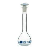 Flask Volumetric class 'A', cap. 25ml, socket size 10/19, borosilicate glass, Blue Printing-EIS-CH0446C offers a thoughtfully designed, durable resource for hands-on learning. The neck of the flask is 0.55" outside diameter. The base diameter of the flask is 1.5" and the overall height is 5". Please note: these are hand blown with the capacity in mind and overall dimensions can vary slightly. Hand blown, Class A premium borosilicate 3.3 glass. The stopper is socket size 10/19, made of polypropylene, and is acid proof and autoclavable. Designed to measure and store liquids in the laboratory, but can be used in the home as well -- or even in a set for "potions". Top rack dishwasher safe and autoclavable. Premium borosilicate volumetric Class A flasks with acid proof polypropylene stoppers. Eisco glassware is designed to be used in labs but is often used in homes or garages as well. Eisco Labs Borosilicate glass has the following heat tolerances: Strain Point -515°C | Annealing Point 565°C | Softening Point 820°C.