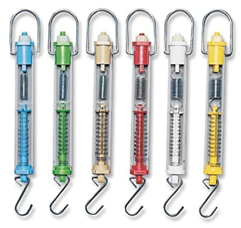 A series of six colour coded spring balances which can be used for both force and measurements.