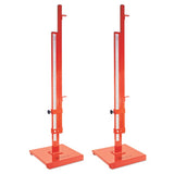 This high jump stand features heavy gauge steel uprights with an 18" steel square base. Constructed with steel risers and welded bar rests, it complies with international standards and is approved by World Athletics. Height is adjustable from 70 cm to 260 cm.