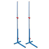 This high jump stand is made from aluminum with a 1.5-inch square tubular pipe and features a steel base with weight. Height is adjustable from 30 cm to 200 cm. Color may vary.