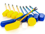 This set includes flexible hockey sticks with large, soft polyurethane foam heads and tight-fitting vinyl grips, along with a soft molded ball for safe play.