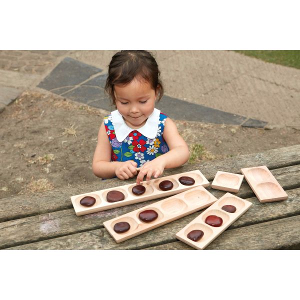 The 1, 2, 3, 4, 5 - Frame Tray Set from Yellow Door is an engaging resource designed to support early mathematical development. Each of the five beautifully crafted trays demonstrates how numbers increase in size and can be represented in a clear, tactile format. Children can use counters or small objects to explore number bonds within a single tray or combine multiple trays to investigate how numbers relate to one another and can be arranged in arrays. Made from FSC-certified beech wood, the set offers both durability and sustainability. The largest tray measures 380 × 80 × 20 mm, while the smallest is 75 × 80 × 20 mm, making them suitable for little hands to manipulate with ease. Safe for children aged 18 months and older, this versatile set encourages hands-on learning, curiosity, and a deeper understanding of number patterns and relationships.